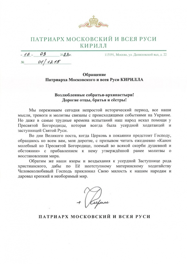 Обращение Патриарха Московского и Всея Руси Кирилла.