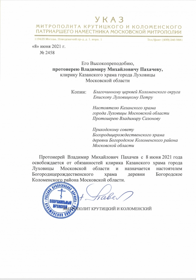 Указ о назначении настоятеля