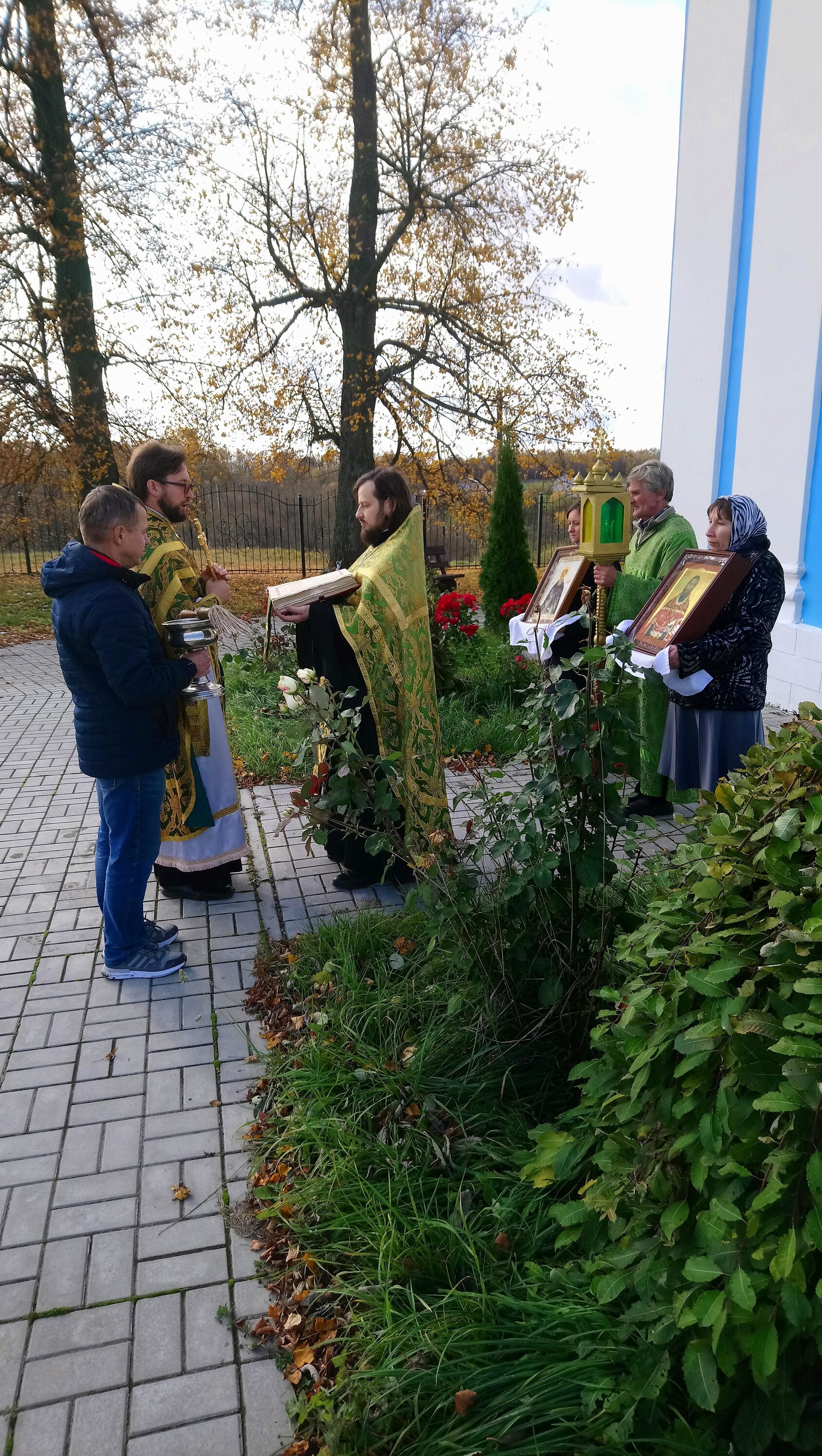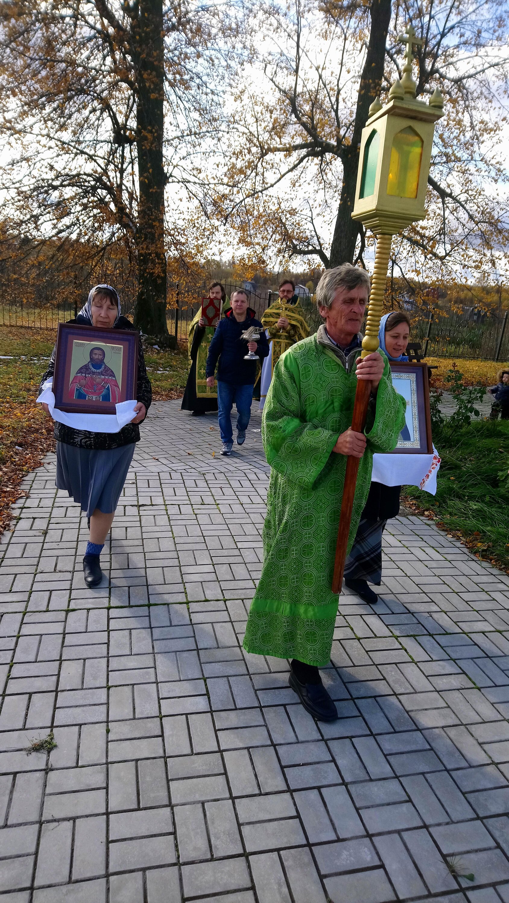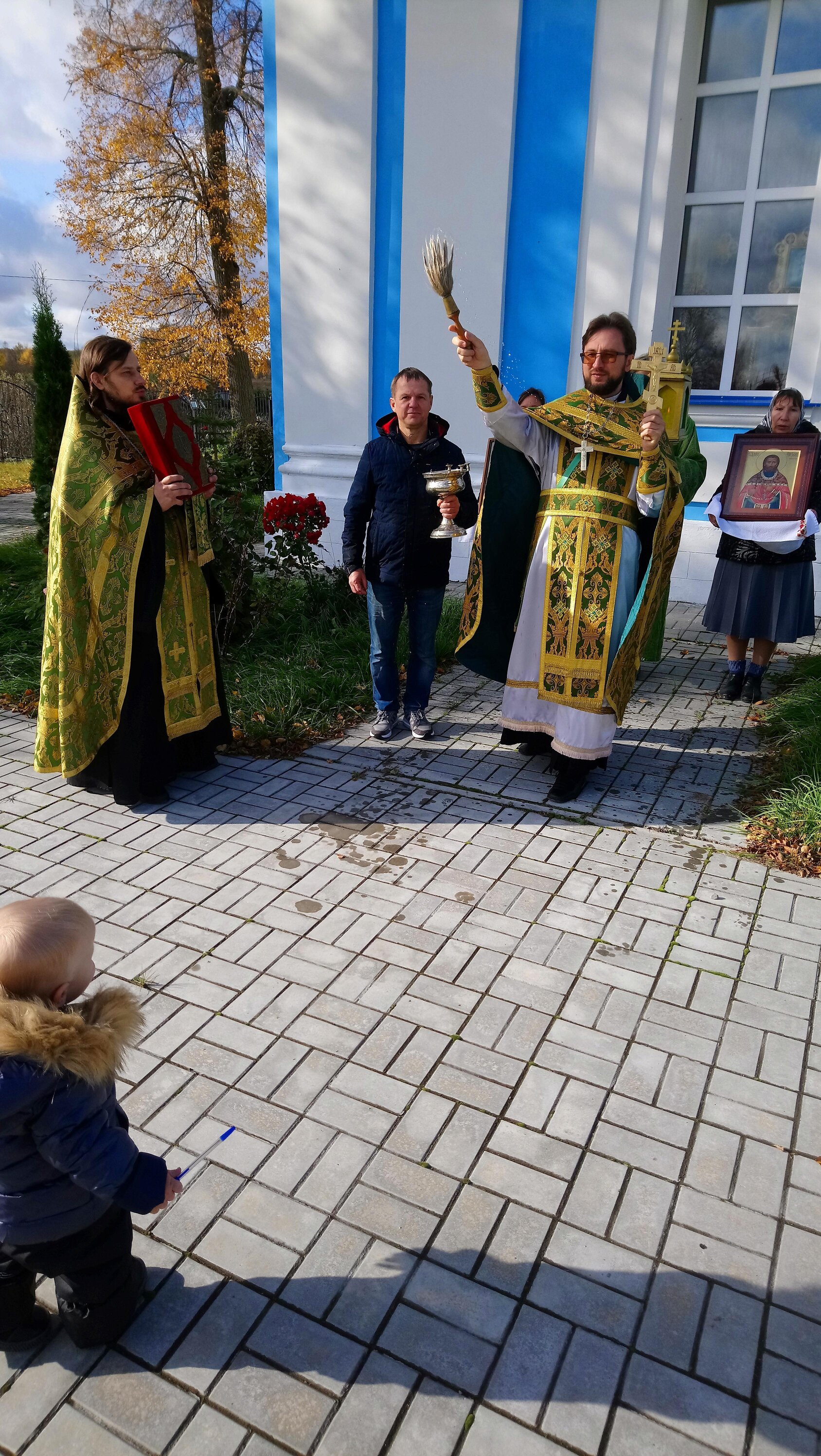 По окончании Литургии состоялся крестный ход, во время которого прихожане несли иконы и святую воду, которой священники окропили молящихся.