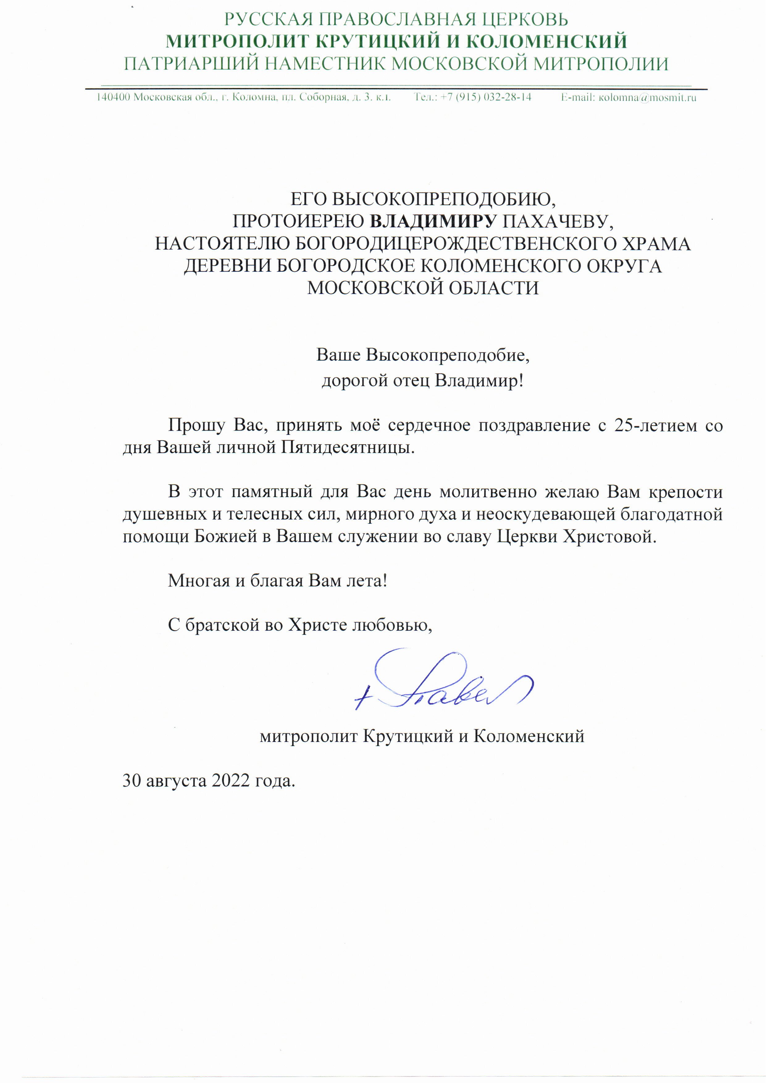 Поздравление Митрополита Крутицкого и Коломенского Павла.