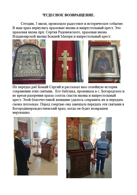 Их передал раб Божий Сергий и рассказал нам семейную история сохранения этих святынь. Его бабушка, проживала в с. Богородском и во время разорения храма смогла спасти иконы и напрестольный крест. Этой благочестивой женщине удалось сохранить их и передать своим потомкам. Перед смертью она завещала передать эти святыни в Богородицерождественский храм, когда он будет возвращен верующим.