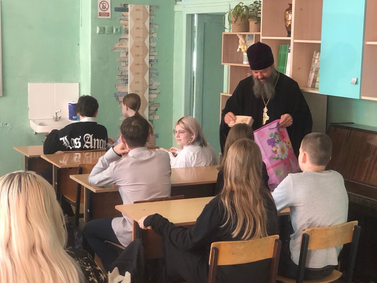 На Пасхальной Седмице, 24 апреля настоятель Богородицерождественского храма протоиерей Владимир Пахачев встретился с учениками 7-го и 4-го классов пановской средней общеобразовательной школы имени Героя Советского Союза П.Л. Черябкина. В начале встречи отец Владимир поздравил всех детей и педагогов со Светоносным Праздником Пасхи и раздал пасхальные подарки.